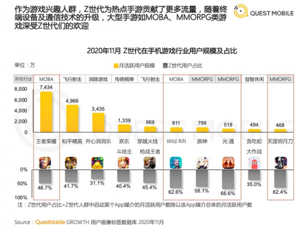 根据Questmobile报告显示,过去5年Z世代移动互联网用户规模持续快速增长,截止2020年11月已达3.2亿规模。作为互联网原生一代,Z世代逐渐成为手游的生力军。通过调研数据来看,当下市场上流行的MOBA、MMORPG等产品中,Z世代用户的占比持续扩大。